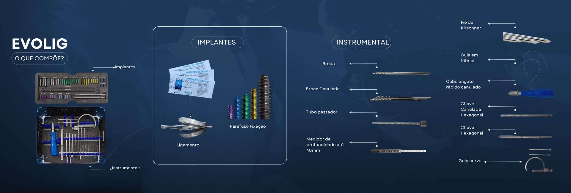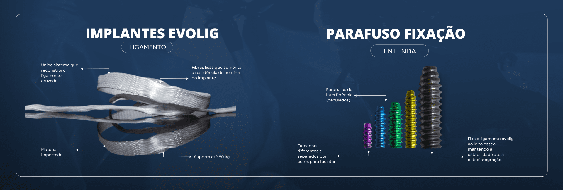 É a única técnica que reconstroi fisiologicamente o ligamento cruzado rompido. Isso é possível porque as fibras do ligamento evolig são livres e minimizam atrito e desgastes. O ligamento é firmemente preso através de parafusos de interferência especialmente desenvolvidos para a técnica.