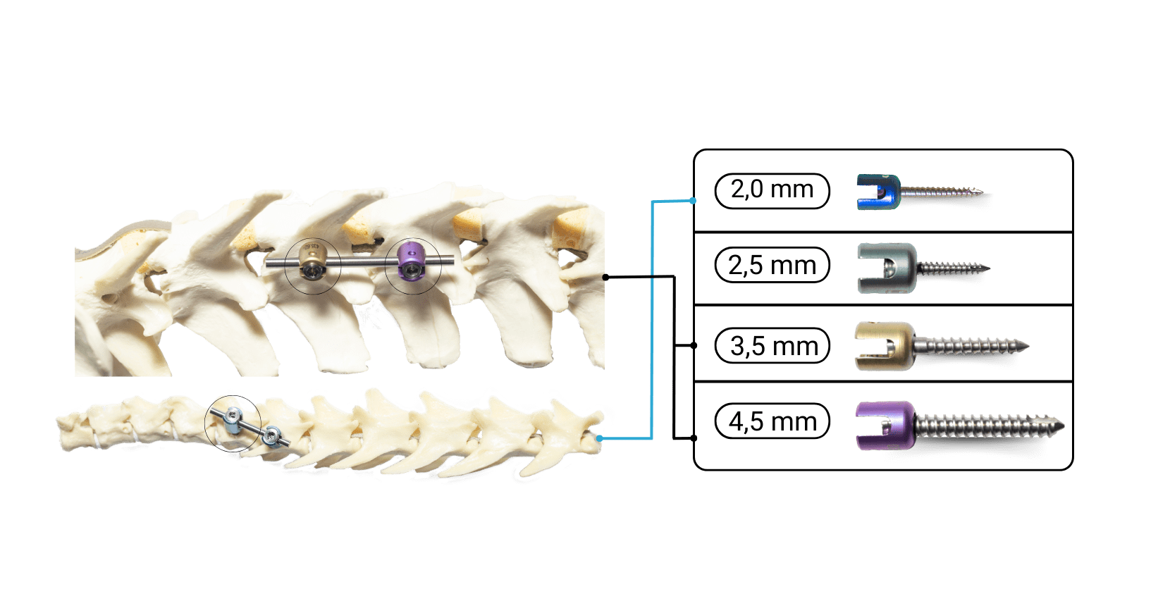 Um Sistema de Coluna totalmente inovador foi desenvolvido, apresentando parafusos poliaxiais novos com um sistema de dominó para emendar barras. Além disso, inclui um sistema de gancho para facilitar a fixação próxima ao sacro em caso de problemas. Também possui um sistema de fixação específico para colunas de gatos e pequenos animais, utilizando parafusos de 2,0 mm.